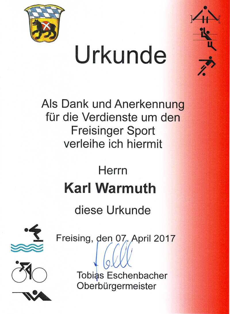 Die Ehrenurkunde der Stadt Freising ist eine weitere Auszeichnung in Karls langer Sportlerlaufbahn für seine Verdienste im Landkreis Freising.